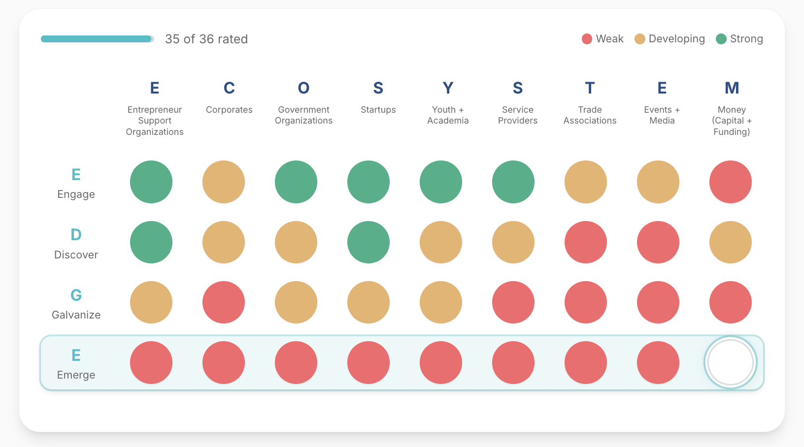 "Not everything that counts can be counted, and not everything that can be counted counts." — William Bruce Cameron Dear Ecosystem Builders, He'd spent seven years building the regional ecosystem. Knew every partner. Could tell you the founding story of half the organizations on the list. But when a funder asked which relationships were actually moving the needle, he went quiet. Not because the work wasn't real. Because he never had a way to show it. That moment isn't a failure of one person. It's a gap in how the entire field has been built. We're at an interesting inflection point in ecosystem building right now. The field is finally catching up to something practitioners have known in their bones for years: building a regional innovation ecosystem is serious, sustained, professional work. It doesn't happen by committee. It doesn't happen after hours. It doesn't happen when the people doing it are under-resourced, under-recognized, and quietly burning out while funders measure event counts. But naming the problem is not the same as knowing where it lives in your region — or what to do about it on Monday morning. After working with 22 ecosystems across our pilot Scorecard sessions, mapping relationship networks across nine partner types and four phases of development, we can tell you: the failure modes are specific. They're measurable. And they show up in the same patterns almost everywhere. Here's what we found. What our Scorecard sessions have revealed.4 out of 5 ecosystems have a corporate engagement gap. Corporates appear on the partner list. They disappear from the partnership map. In nearly every ecosystem we've assessed, the pattern is the same: initial engagement at the surface, then a systematic drop-off at every subsequent phase — Discover, Galvanize, Emerge. Trade associations are even more stark. In most assessments, gaps across all four phases. Not developing. Not weak. Non-existent. This isn't a willingness problem. Corporates and ecosystem builders are operating in different languages, on different timescales, measuring different things. The organizational distance is real — and without deliberate bridge-building first, outreach doesn't convert. More introductions don't close that gap. Structural bridge-building does. This matters because corporates and trade associations are where market access lives. They're where founders find customers, where startups find credibility, where ecosystems find the private-sector anchor that makes everything else fundable. Without them, you're building in a vacuum. The ecosystems that appear the most active are often the most stuck. This is the finding that surprises people most. The ecosystems with the busiest event calendars. The most active Slack channels. The longest partner lists. They are often the ones most deeply frozen in the first two phases of partnership development — Engage and Discover. They are great at showing up. They are not yet Galvanizing. They are not yet Emerging. When we probe beneath this pattern, we find the same thing almost every time: partners can't give the same answer about what the ecosystem ultimately exists to accomplish. There's activity. There's goodwill. But there's no shared pull toward a common purpose — and without that, engagement stalls at the surface. People connect, then quietly disengage because there's no compelling reason to go deeper. If you asked your five most active partners what this ecosystem ultimately exists to accomplish — would they give roughly the same answer? In most ecosystems, they wouldn't. That invisible gap is what keeps Engage from ever becoming Galvanize. Funders are asking the wrong questions. And coalitions are optimized to answer them. Every funder conversation eventually circles back to the same metrics: How many events did you host? How many people attended your programs? How many patents did you generate? How many partners are on your list? None of that predicts ecosystem health. And here's the harder truth: ecosystems have become very good at producing exactly what funders measure. Not because builders are cynical — most are doing this work because they genuinely believe in it. But when the reporting requirements reward activity, you build for activity. When the grant cycle is two years, you build for two years. When no one is asking about relationship depth or partner breadth or what happens if this funding disappears tomorrow, you don't build infrastructure for those things. You build for what gets counted. The result is a field full of ecosystems that are grant-coalition-shaped rather than region-opportunity-shaped. Built around a funding source rather than a shared problem. Optimized for the funder's dashboard rather than the region's long-term capacity. This matters enormously right now. With federal programs constrained, state budgets under pressure, and philanthropy shifting priorities, the ecosystems that will keep moving are the ones whose relationship infrastructure was never dependent on any single funder to begin with. The ones where partners are showing up because of shared purpose, not because someone made a call. The ones where trust was built into the architecture, not just the calendar. Funders didn't create this problem on purpose. But the metrics they've required have shaped the ecosystems they're now frustrated by. That's not a character flaw — it's a system design problem. And it's fixable. But only if funders start asking different questions, and only if ecosystem builders architect the tools to answer them. In nearly every ecosystem we've assessed, the relationship infrastructure lives in one or two people. Their judgment. Their trust. Their institutional memory of which call to make, who to bring into the room, how to hold tension between partners who don't naturally trust each other. When that person burns out, moves on, or loses funding — and they do, because ecosystem builders are among the most under-resourced professio