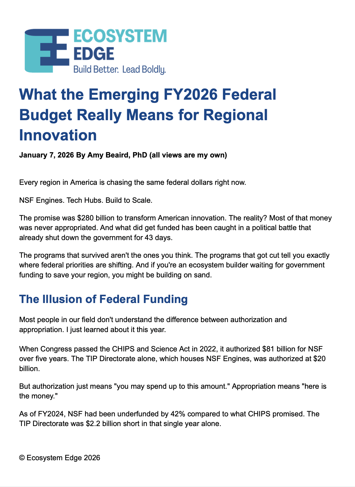 Funding Opportunities for Ecosystem BuildersCongress just approved a mini-bus that covers many ecosystem building programs. If you are trying to make sense of the federal landscape, read our guide. Federal Funding In 2026: What Ecosystem Builders Need to Know Now